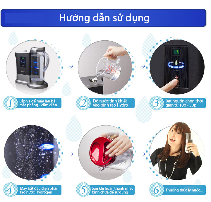 Bạn có thể tùy chọn thời gian máy làm việc từ 10 phút – 20 phút – 30 phút cho mỗi chu kỳ tạo nước giàu Hydro. Thời gian càng dài nước càng giàu Hydro. Theo kinh nghiệm của chúng tôi mỗi lần ban nên đồ đầy bình đựng nước (1.8L) và thiết lập thời gian 30 phút. Ngoài ra trong bình đựng nước còn có vỉ đĩa giúp ngăn hydro thoát ra mỗi lần bạn rót nước hay không sử dụng.