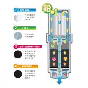 Lõi 1: bộ lọc sợi PP 5 Micron -> Lõi 2: bộ lọc than hoạt tính CTO -> Lõi 3: bộ lọc sợi PP 1 Micron -> Lõi 4: Màng lọc UF kèm than hoạt tính + bạc